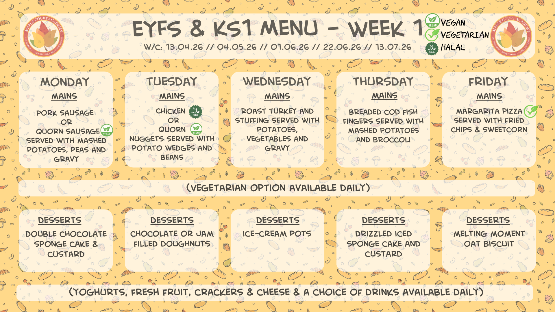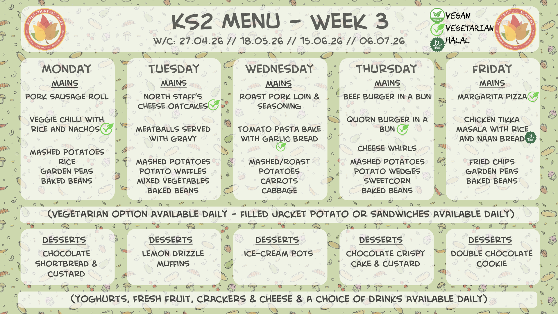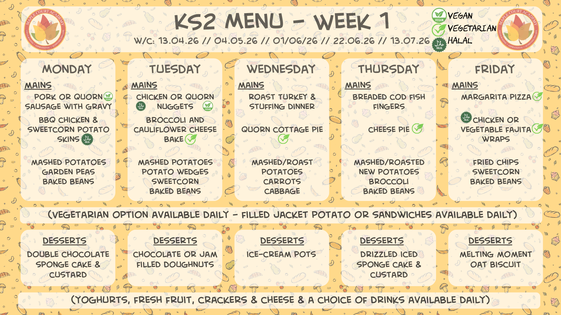 Our Catering staff provide a set menu for children in Foundation Stage and KS1 with good variety throughout the week.KS2 children have a choice menu with main options to choose from, with plenty of variety. All menus can be viewed below