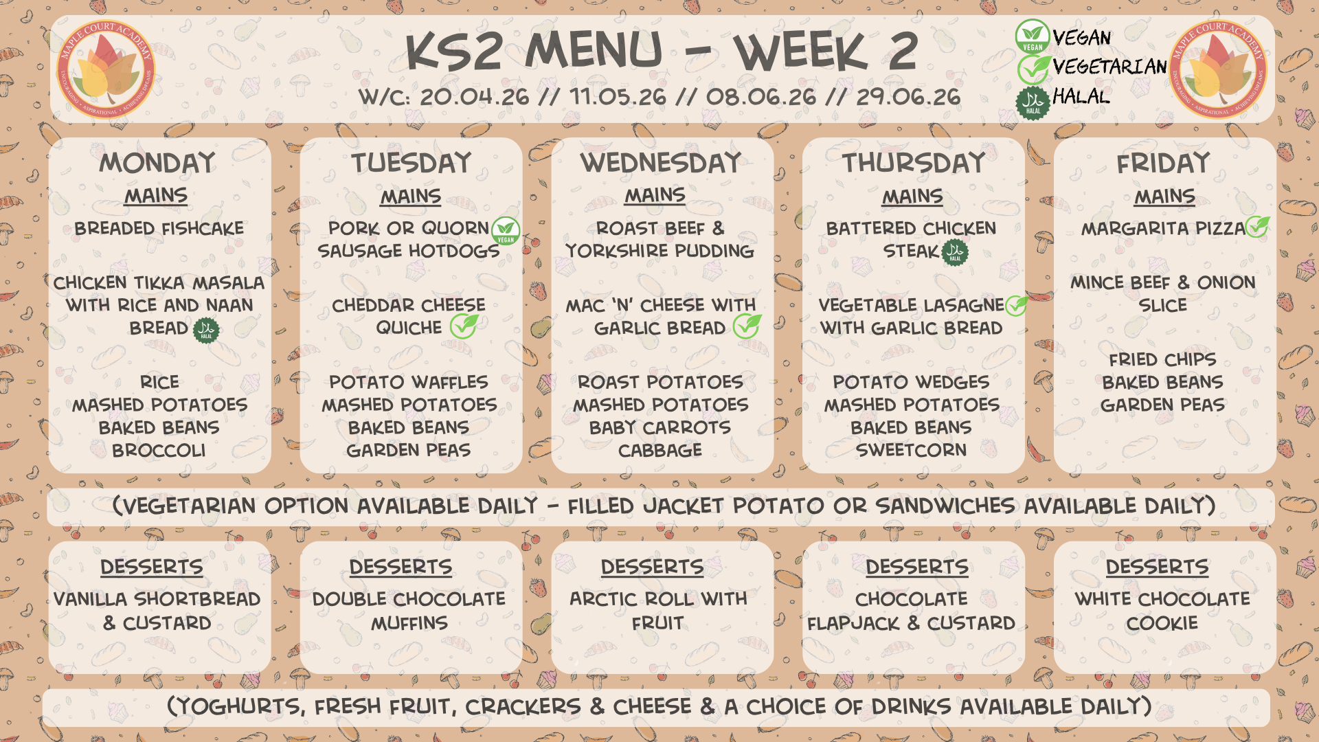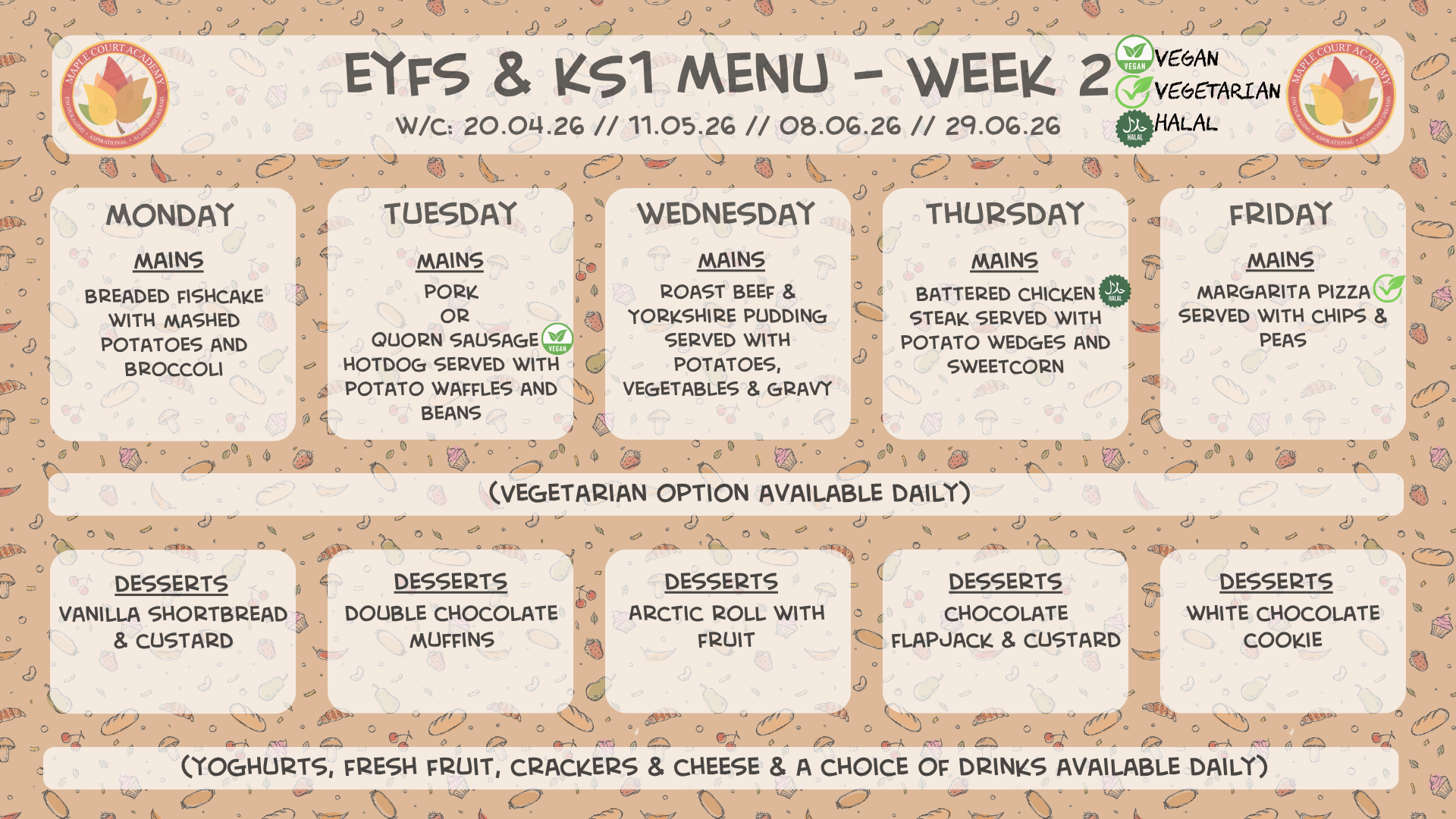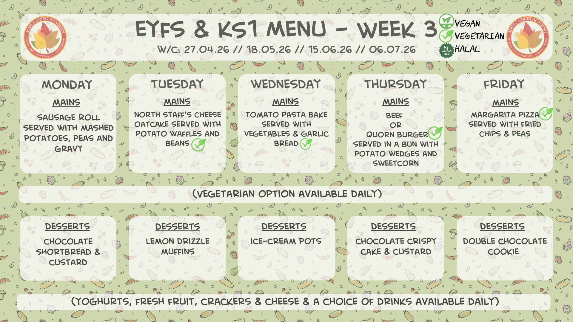 Our Catering staff provide a set menu for children in Foundation Stage and KS1 with good variety throughout the week.KS2 children have a choice menu with main options to choose from, with plenty of variety. All menus can be viewed below